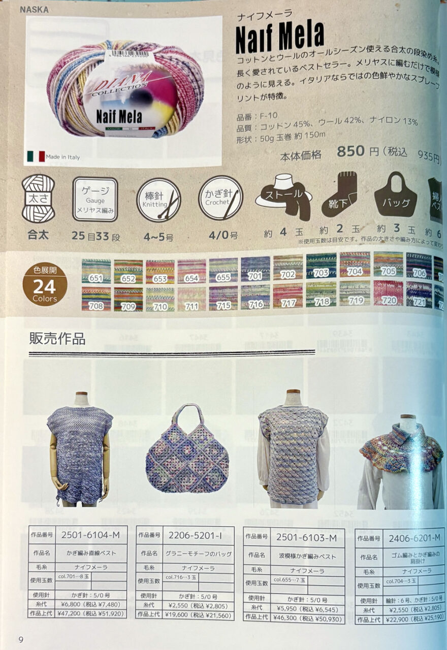 コットン 45%ウール 42%ナイロン 13%玉巻 50g糸長 約150m棒針 4~5号かぎ針 4/0号税込価格 935円/玉