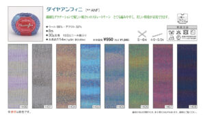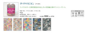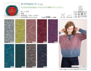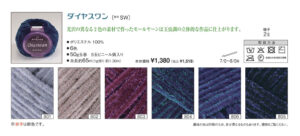 綿 72%アクリル 20%ナイロン 8%玉巻 25g糸長 約145m棒針 –かぎ針 –税込価格 715円5玉ビニール入り