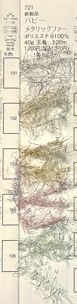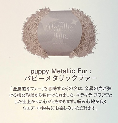 パピー メタリックファー 新製品 2025年5月22日 最終更新日時 : 2025年5月26日 admin ポリエステル 100%玉巻 40g糸長 125m棒針 6~8号税込価格 1,320円 /玉一袋5玉入り FacebookXCopy