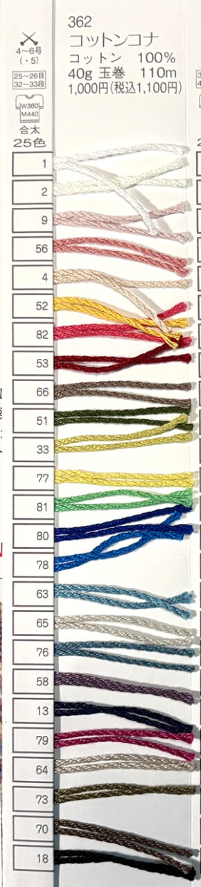 コットンコナ 2025年5月22日 最終更新日時 : 2025年5月22日 admin コットン 100%玉巻 40g糸長 110m棒針 4~6号税込価格 1,100円 /玉 FacebookXCopy