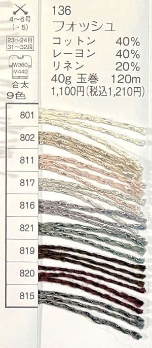 フォッシュ 2025年5月22日 最終更新日時 : 2025年5月22日 admin コットン 40%レーヨン 40%リネン 20%玉巻 40g糸長 120m棒針 4~6号税込価格 1,210円 /玉 FacebookXCopy