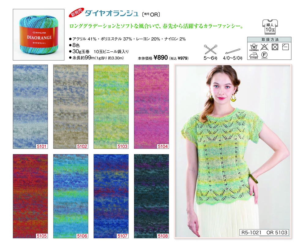 ダイヤオランジュ 新製品 2025年5月22日 最終更新日時 : 2025年5月22日 admin アクリル 41%ポリエステル 37%ナイロン 2%玉巻 30g糸長 約99m棒針 5~6号かぎ針 4/0~5/0号税込価格 979円 FacebookXCopy