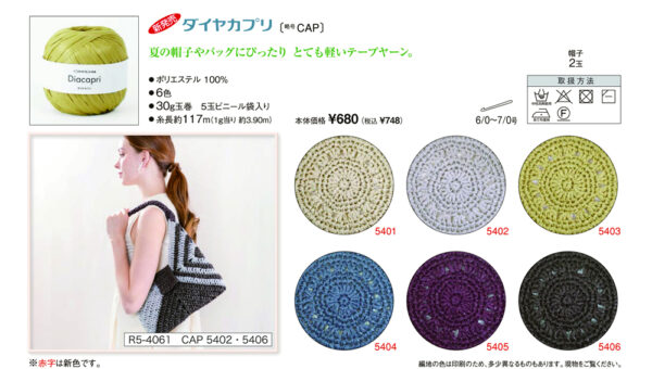 ダイヤカプリ 新製品 2025年5月22日 最終更新日時 : 2025年5月22日 admin ポリエステル 100%玉巻 30g糸長 約117m棒針 --かぎ針 6/0~7/0号税込価格 748円 FacebookXCopy