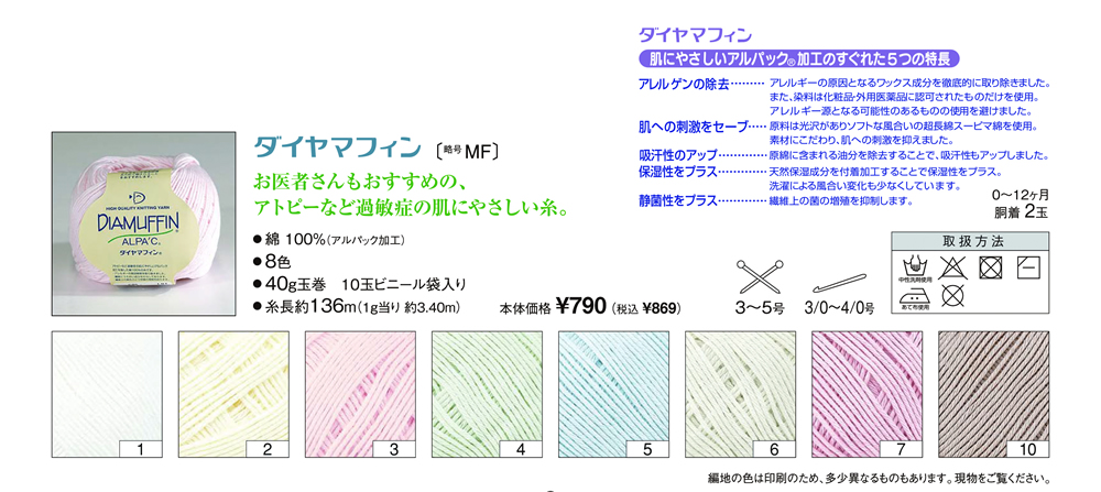 ダイヤマフィン 2025年5月22日 最終更新日時 : 2025年5月22日 admin 綿 100%玉巻 40g 糸長 約136m棒針 3~5号かぎ針 3/0~4/0号税込価格 869円/玉 FacebookXCopy