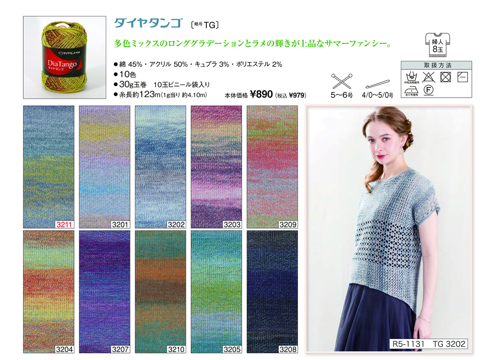 ダイヤタンゴ 2025年5月22日 最終更新日時 : 2025年5月22日 admin 綿 45%アクリル 50%キュプラ 3%ポリエステル 2%玉巻 30g糸長 約123m棒針 5~6号かぎ針 4/0~5/0号税込価格 979円 FacebookXCopy
