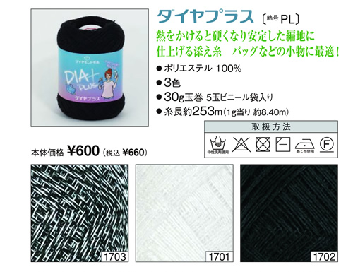 ダイヤプラス 2025年5月22日 最終更新日時 : 2025年5月26日 admin ポリエステル 100%玉巻 30g糸長 約253m棒針 10~12号かぎ針 7/0~8/0号税込価格 660円1袋5玉入り FacebookXCopy