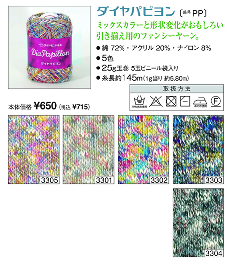 ダイヤパピヨン 2025年5月22日 最終更新日時 : 2025年5月26日 admin 綿 72%アクリル 20%ナイロン 8%玉巻 25g糸長 約145m棒針 –かぎ針 –税込価格 715円5玉ビニール入り FacebookXCopy