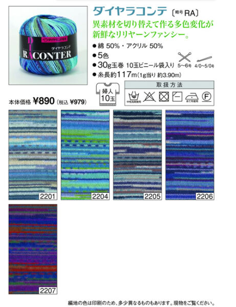 ダイヤラコンテ 2025年5月22日 最終更新日時 : 2025年5月26日 admin 綿 50%アクリル 50%玉巻 30g糸長 117m棒針 5~6号かぎ針 4/0~5/0号税込価格 979円 /玉 FacebookXCopy