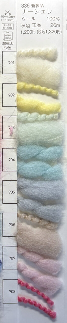 ナーシェレ <新製品> 2025年10月1日 最終更新日時 : 2025年10月4日 admin ウール 100%玉巻 50g糸長 約26m棒針 10~12mm税込価格 1,320円 FacebookXCopy