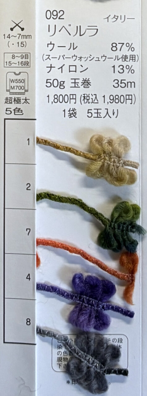 リベルラ 2025年10月1日 最終更新日時 : 2025年10月4日 admin イタリーウール 87%ナイロン 13%玉巻 50g糸長 約35m棒針 14~7mm税込価格 1,980円1袋5玉入り FacebookXCopy