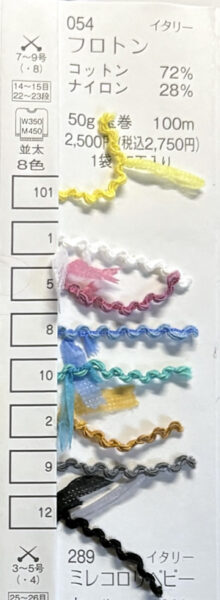 フロトン 2025年10月1日 最終更新日時 : 2025年10月4日 admin イタリーコットン 72%ナイロン 28%玉巻 50g糸長 100m棒針 7~9号税込価格 2,750円 /玉1袋 5玉 FacebookXCopy
