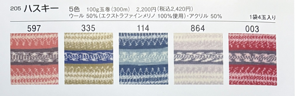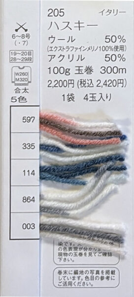ハスキー 2025年10月1日 最終更新日時 : 2025年10月4日 admin イタリーウール 50%アクリル 50%玉巻 100g糸長 約300m棒針 6~8号税込価格 2,420円1袋4玉入 FacebookXCopy