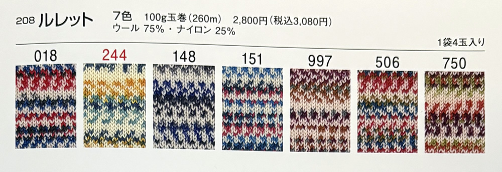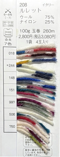 ルレット 2025年10月1日 最終更新日時 : 2025年10月4日 admin イタリーウール 75%ナイロン 25%玉巻 100g糸長 約260m棒針 6‐8号税込価格 3,080円4玉入り FacebookXCopy