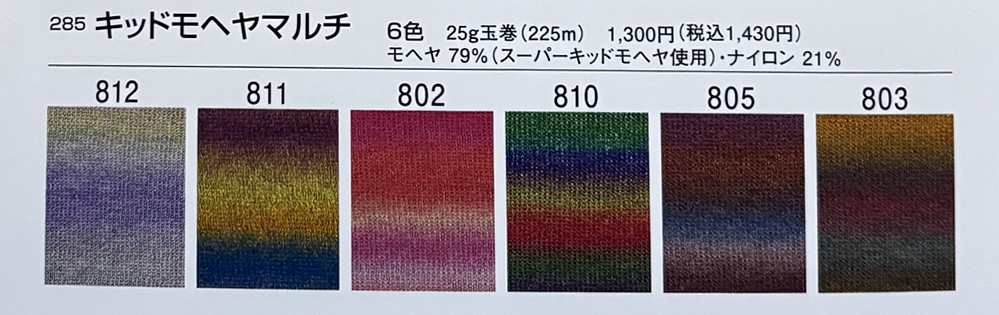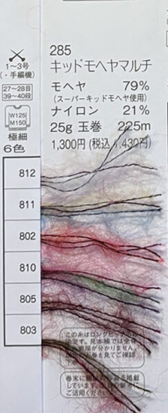 キッドモヘアマルチ 2025年10月1日 最終更新日時 : 2025年10月4日 admin モヘヤ 79%(スーパーキッドモヘア使用)ナイロン 21%25g玉 約225m棒針 1~3号税込価格 1,430円 FacebookXCopy