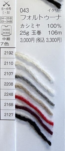 フォルトゥーナ 2025年10月1日 最終更新日時 : 2025年10月4日 admin イタリーカシミア 100%玉巻 25g糸長 約106m棒針 3~5号税込価格 3,300円 FacebookXCopy