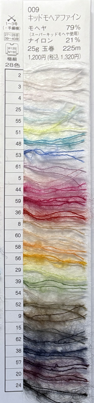 キッドモヘアファイン 2025年10月1日 最終更新日時 : 2025年10月4日 admin モヘア 79%ナイロン 21%玉巻 25g糸長 約225m棒針 1~3号税込価格 1,320円 FacebookXCopy