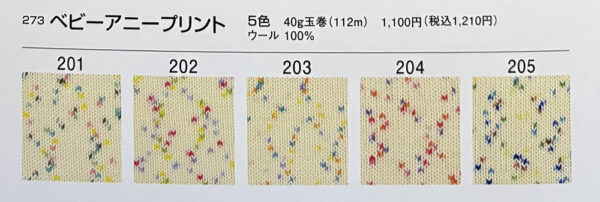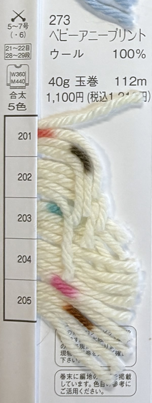 ベビーアニープリント 2025年10月1日 最終更新日時 : 2025年10月4日 admin ウール 100%玉巻 40g糸長 約112m棒針 5~7号税込価格 1,210円 FacebookXCopy