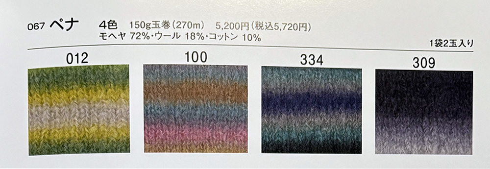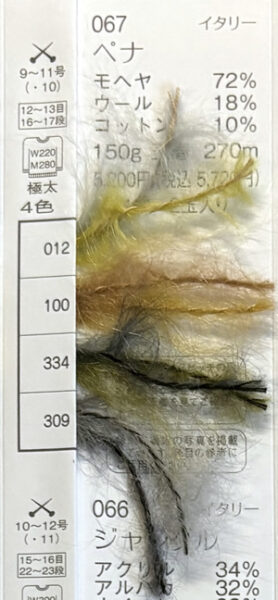 ペナ 2025年10月1日 最終更新日時 : 2025年10月4日 admin イタリー モヘア 72%ウール 18%コットン 10%玉巻 150g糸長 約270m棒針 9~11号税込価格 5,720円1袋2玉入 FacebookXCopy
