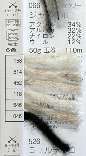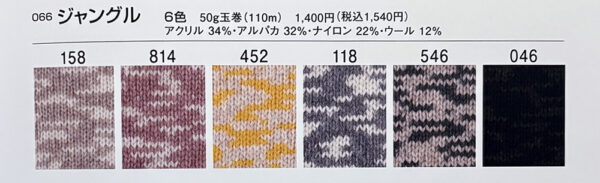ジャングル 2025年10月1日 最終更新日時 : 2025年10月4日 admin イタリーアクリル 34%アルパカ 32%ナイロン 22%ウール 12%玉巻 50g糸長 約110m棒針 8~10mm税込価格 1,540円 FacebookXCopy