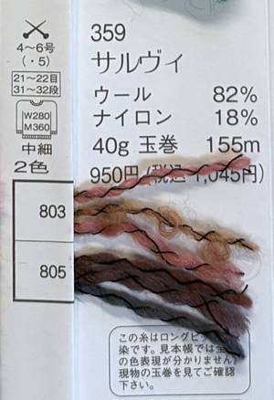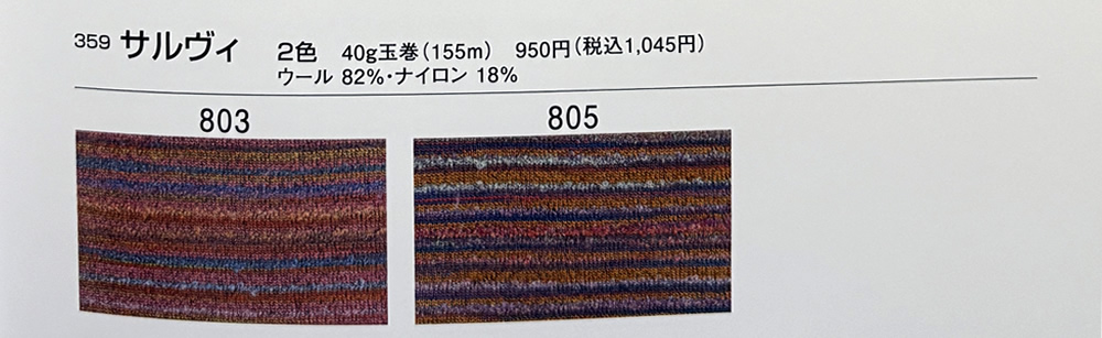 サルヴィ 2025年10月1日 最終更新日時 : 2025年10月4日 admin ウール 82%ナイロン 18%玉巻 40g糸長 約155m棒針 4~6号税込価格 1,045円 FacebookXCopy