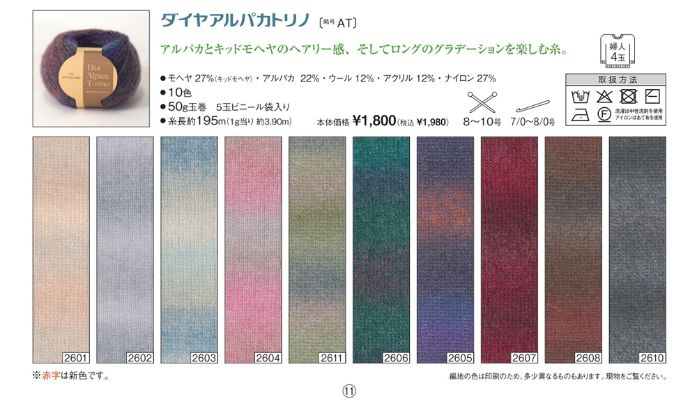 ダイヤアルパカトリノ 2025年10月2日 最終更新日時 : 2025年10月4日 admin モヘア 27%アルパカ 22%ウール 12%アクリル 12%ナイロン 27%玉巻 50g糸長 約195m棒針 8~10号かぎ針 7/0~8/0号税込価格 1,980円 FacebookXCopy