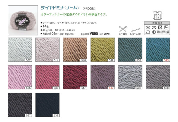 ダイヤドミナ(ノーム) 2025年10月2日 最終更新日時 : 2025年10月4日 admin ウール 58%モヘヤ 15%ナイロン 27%玉巻 40g糸長 約108m棒針 6~8号かぎ針 6/0~7/0号税込価格 979円 FacebookXCopy