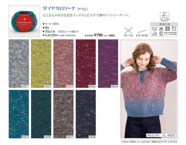 ダイヤカロリーナ 2025年10月2日 最終更新日時 : 2025年10月4日 admin ウール 100%玉巻 30g糸長 約90m棒針 6~7号かぎ針 5/0~6/0号税込価格 869円 FacebookXCopy