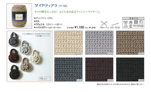 ダイヤティアラ 2025年10月2日 最終更新日時 : 2025年10月4日 admin ポリエステル 100%玉巻 50g糸長 約92m棒針 15号~7mmかぎ針 8/0~10/0号税込価格 1,210円1袋5玉入り FacebookXCopy
