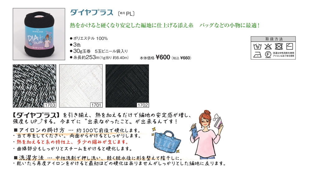 ダイヤプラス 2025年10月2日 最終更新日時 : 2025年10月4日 admin ポリエステル 100%玉巻 30g糸長 約253m棒針 10~12号かぎ針 7/0~8/0号税込価格 660円1袋5玉入り FacebookXCopy