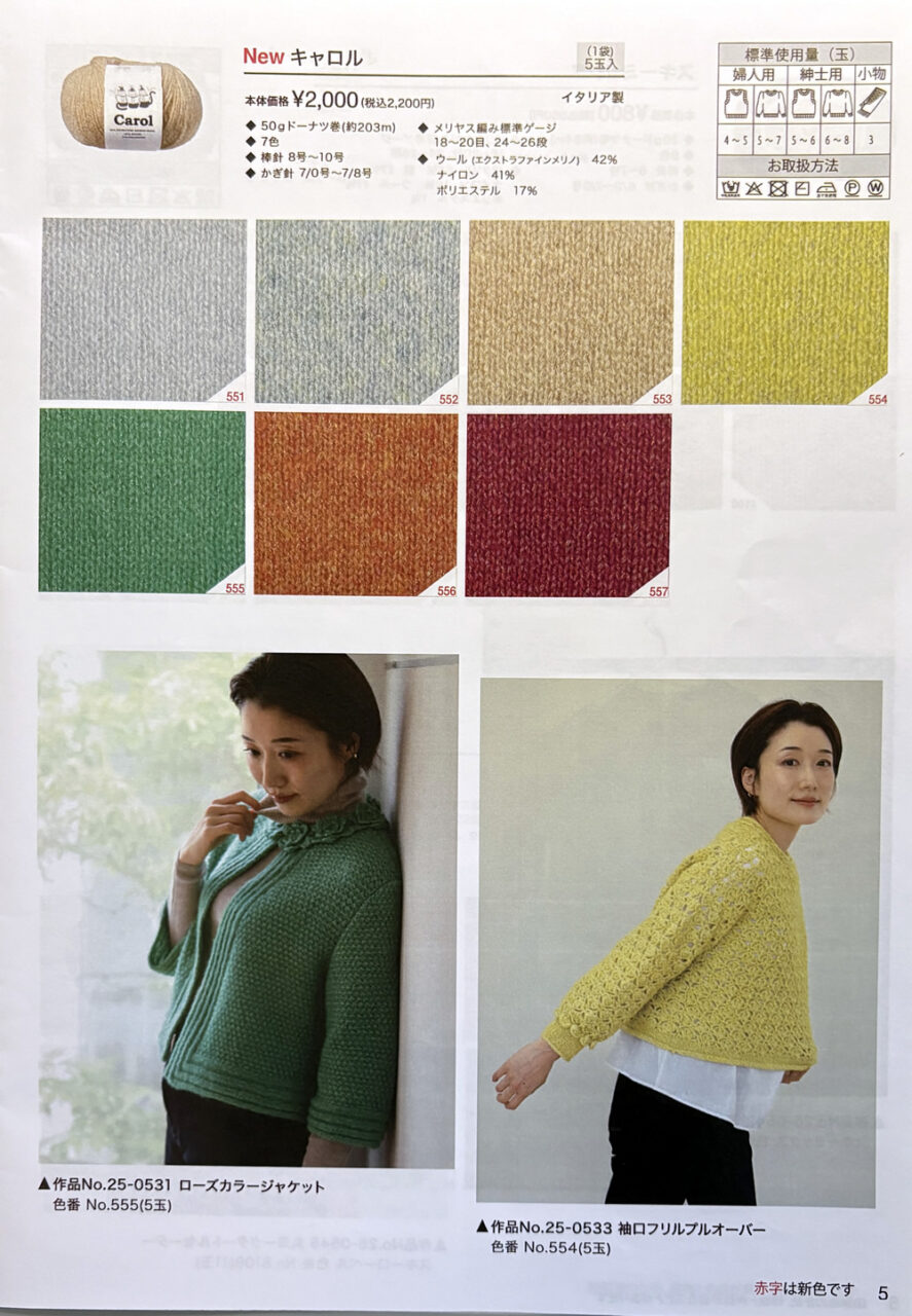 キャロル 新製品 2025年10月2日 最終更新日時 : 2025年10月4日 admin イタリーウール 42%ナイロン 41%ポリエステル 17%玉巻 50g(ドーナツ巻)糸長 約203m棒針 8~10号かぎ針 7/0号~7/8号税込価格 2,200円 /玉1袋5玉入り FacebookXCopy