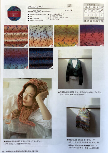アルコバレーノ 2025年10月2日 最終更新日時 : 2025年10月4日 admin ウール 54%アクリル 36%ナイロン 10%玉巻 100g糸長 約270m棒針 11~13号かぎ針 8/0~10/0号税込価格 2,750円1袋3玉入り FacebookXCopy