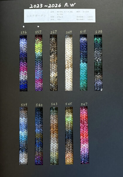 シルクガーデン 2025年10月2日 最終更新日時 : 2025年10月4日 admin 絹 45%モヘヤ 45%ウール 10%玉巻 50g糸長 約100m棒針 8~10号税込価格 1,650円 FacebookXCopy