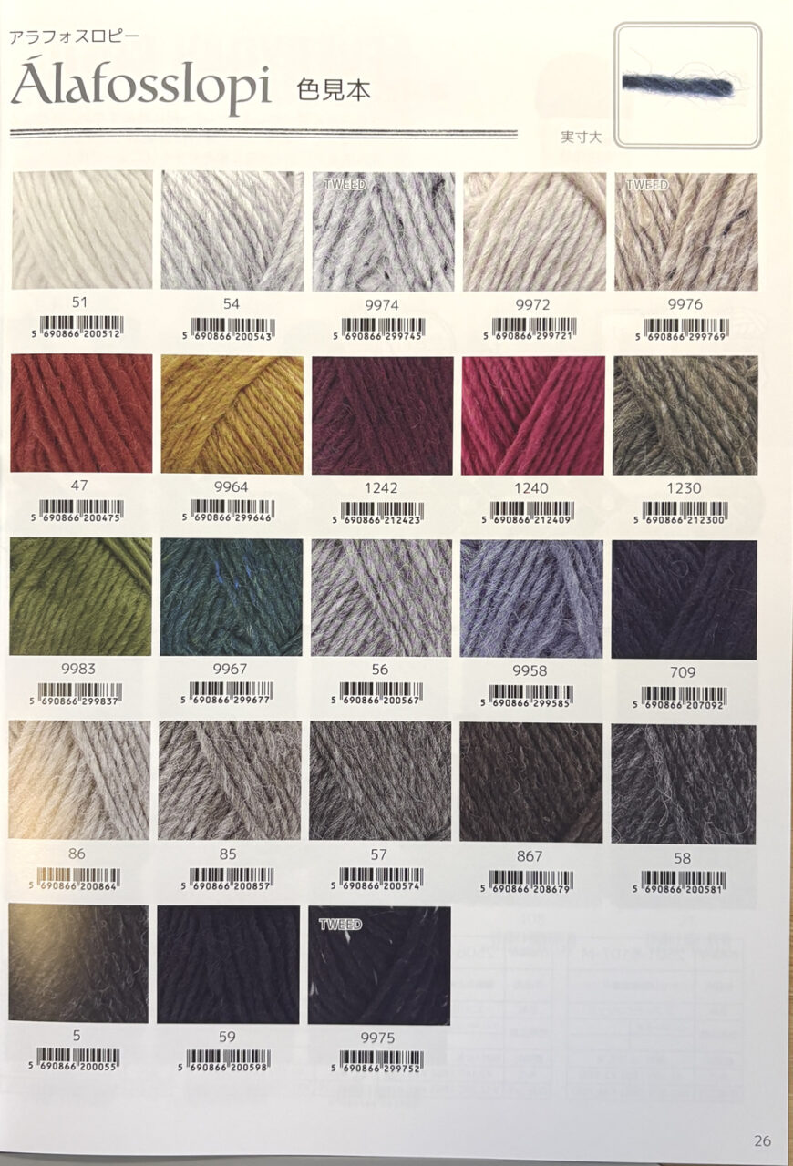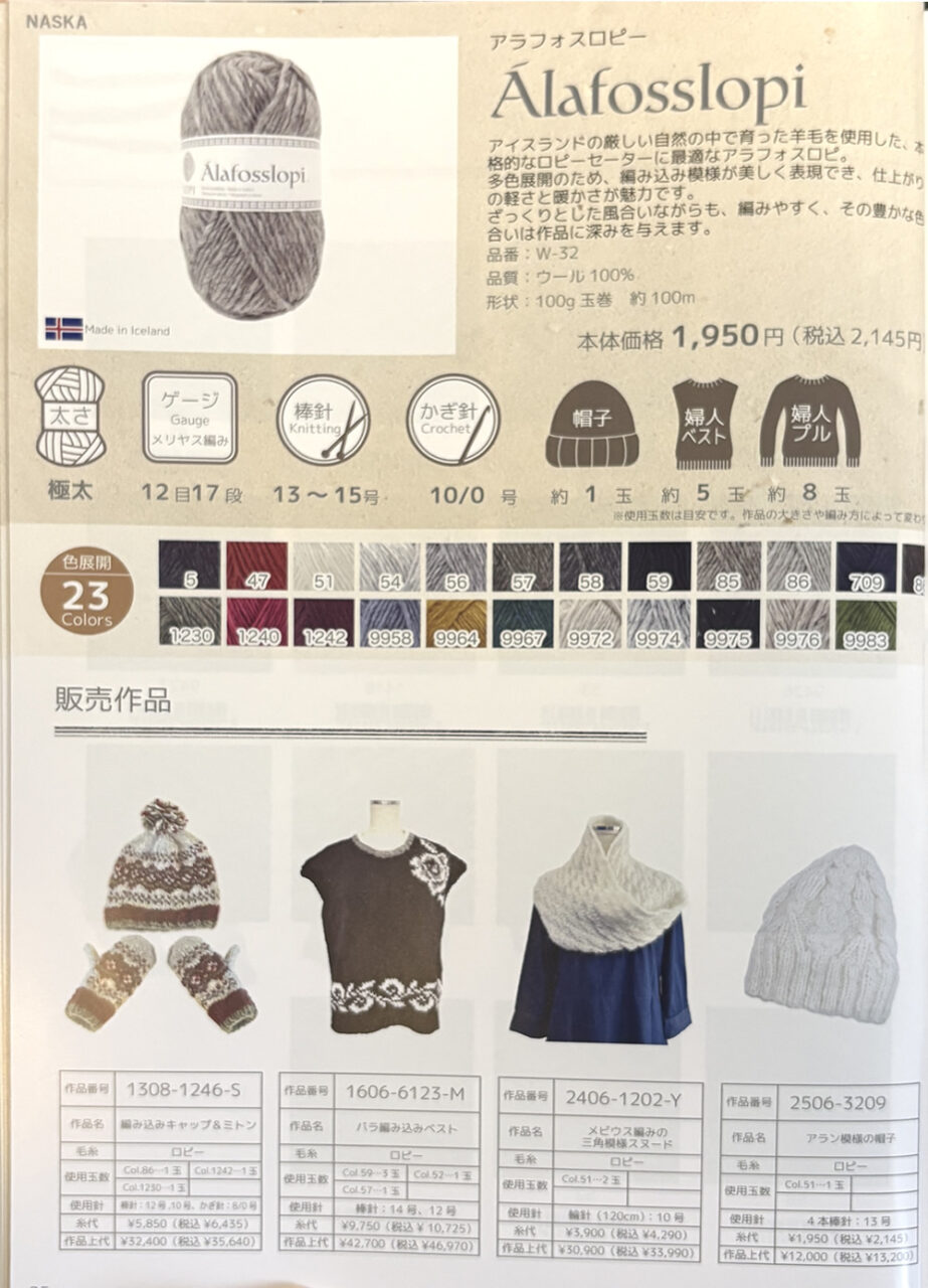 Alafosslopi(アラフォスロピー) 2025年10月2日 最終更新日時 : 2025年10月4日 admin ウール 100%玉巻 100g糸長 約100m棒針 13~15号かぎ針 10/0号税込価格 1,980円 FacebookXCopy