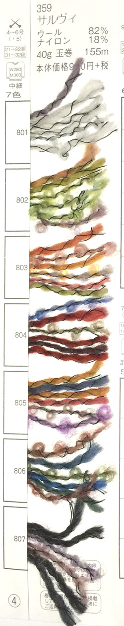 サルヴィ 359 2016年10月21日 最終更新日時 : 2016年10月21日 admin ウール 82% ナイロン 18% 40g玉 約155m 棒針 4~6号 本体価格 950円 FacebookXCopy