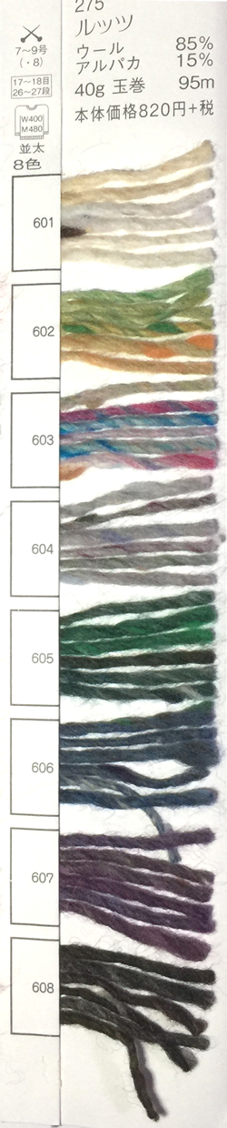ルッツ 275 2016年10月21日 最終更新日時 : 2016年10月21日 admin ウール 85% アルパカ 15% 40g玉 約95m 棒針 7~9号 本体価格 820円 FacebookXCopy