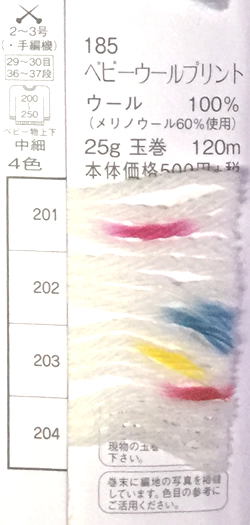 ベビーウールプリント 185 2016年10月21日 最終更新日時 : 2016年10月21日 admin ウール 100% 25g玉 約120m 棒針 2~3号 本体価格 500円 FacebookXCopy