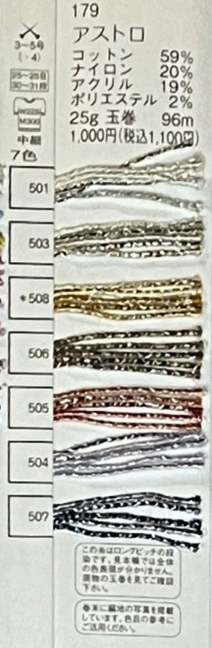 アストロ 2024年5月18日 最終更新日時 : 2024年5月18日 admin コットン 59%ナイロン 20%アクリル 19%ポリエステル 2%玉巻 25g糸長 96m棒針 3~5号税込価格 1,100円 /玉 FacebookXCopy
